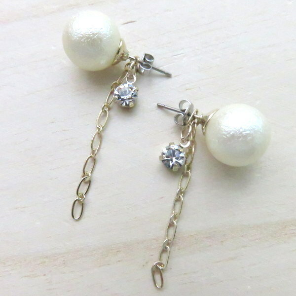 チェーン ガラスビジュー シンプル パール ピアス コットン風 シュリンク 大粒 12mm ゴールド色 流行人気 ボリューム 結婚式お呼ばれ お出かけ デート 会 プレゼント 華やかギフト クリスマス パーティー キスカ アイボリー お得感3WAY!大粒が華やか!チェーンと12mmのコットン風パール。